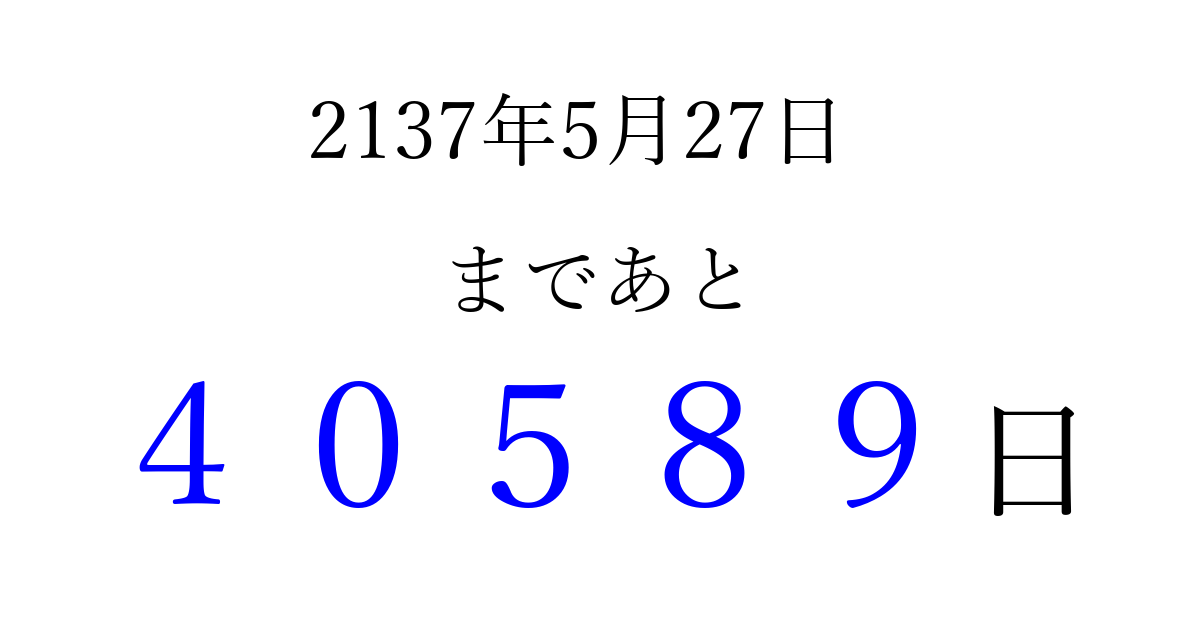 2137年5月27日(月)まで あと 99999 日です 追加すると、トップページからすぐ選べるようになります ※2026/04/10現在の結果です。 最新の状態に更新する ↓シェアして、タイムライン上にカウントダウンを表示しよう!↓ 📤 この結果を共有する Tweet シェア Threads Bluesky 別の日付でカウントダウン 2137年5月のカレンダー このページをブックマークに追加すると、いつでもカウントダウンを確認できます。 (PC: Ctrl+D / Mac: ⌘+D) hitome-notes.comでは以下のページも運営しています。 指定日と期間から日付を計算 | ガチャ確率計算・シミュレーション | プライバシー・ポリシー 運営者:Avocado