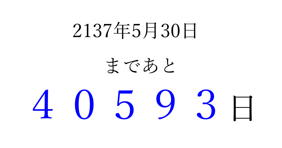 2137年5月30日(木)まで あと 99999 日です 追加すると、トップページからすぐ選べるようになります ※2026/04/09現在の結果です。 最新の状態に更新する ↓シェアして、タイムライン上にカウントダウンを表示しよう!↓ 📤 この結果を共有する Tweet シェア Threads Bluesky 別の日付でカウントダウン 2137年5月のカレンダー このページをブックマークに追加すると、いつでもカウントダウンを確認できます。 (PC: Ctrl+D / Mac: ⌘+D) hitome-notes.comでは以下のページも運営しています。 指定日と期間から日付を計算 | ガチャ確率計算・シミュレーション | プライバシー・ポリシー 運営者:Avocado