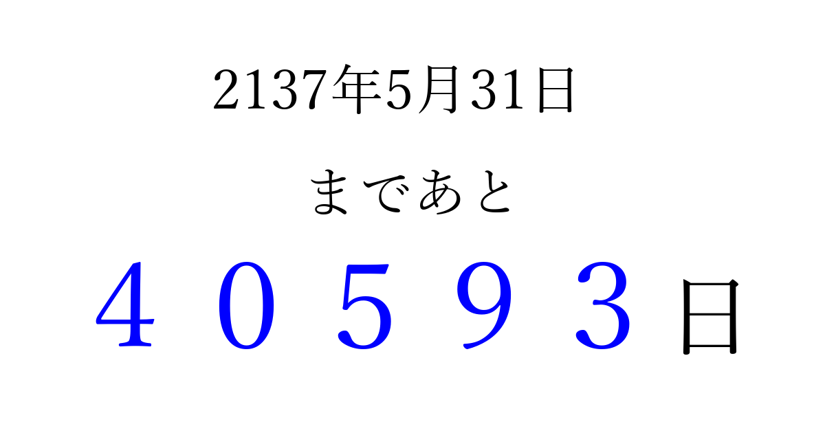 2137年5月31日(金)まで あと 99999 日です 追加すると、トップページからすぐ選べるようになります ※2026/04/10現在の結果です。 最新の状態に更新する ↓シェアして、タイムライン上にカウントダウンを表示しよう!↓ 📤 この結果を共有する Tweet シェア Threads Bluesky 別の日付でカウントダウン 2137年5月のカレンダー このページをブックマークに追加すると、いつでもカウントダウンを確認できます。 (PC: Ctrl+D / Mac: ⌘+D) hitome-notes.comでは以下のページも運営しています。 指定日と期間から日付を計算 | ガチャ確率計算・シミュレーション | プライバシー・ポリシー 運営者:Avocado