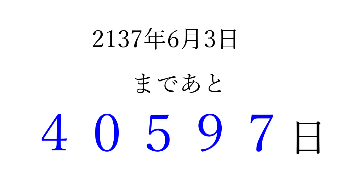 2137年6月3日(月)まで あと 99999 日です 追加すると、トップページからすぐ選べるようになります ※2026/04/09現在の結果です。 最新の状態に更新する ↓シェアして、タイムライン上にカウントダウンを表示しよう!↓ 📤 この結果を共有する Tweet シェア Threads Bluesky 別の日付でカウントダウン 2137年6月のカレンダー このページをブックマークに追加すると、いつでもカウントダウンを確認できます。 (PC: Ctrl+D / Mac: ⌘+D) hitome-notes.comでは以下のページも運営しています。 指定日と期間から日付を計算 | ガチャ確率計算・シミュレーション | プライバシー・ポリシー 運営者:Avocado