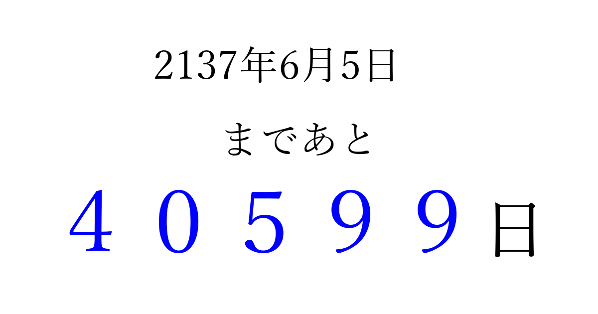 2137年6月5日(水)まで あと 99999 日です 追加すると、トップページからすぐ選べるようになります ※2026/04/09現在の結果です。 最新の状態に更新する ↓シェアして、タイムライン上にカウントダウンを表示しよう!↓ 📤 この結果を共有する Tweet シェア Threads Bluesky 別の日付でカウントダウン 2137年6月のカレンダー このページをブックマークに追加すると、いつでもカウントダウンを確認できます。 (PC: Ctrl+D / Mac: ⌘+D) hitome-notes.comでは以下のページも運営しています。 指定日と期間から日付を計算 | ガチャ確率計算・シミュレーション | プライバシー・ポリシー 運営者:Avocado