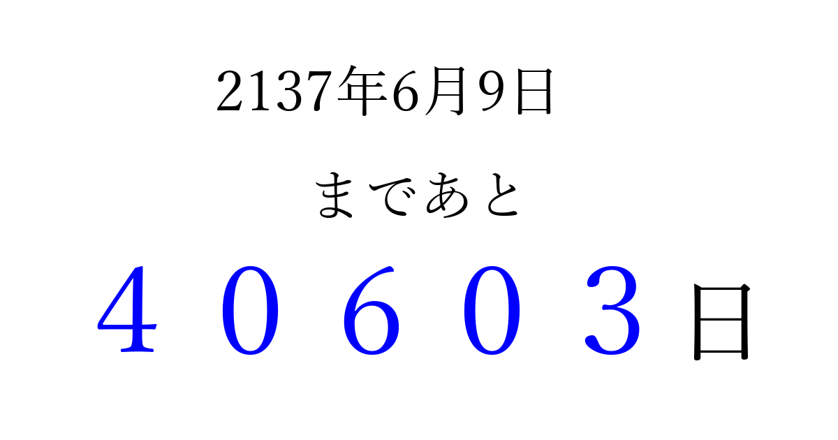 2137年6月9日(日)まで あと 99999 日です 追加すると、トップページからすぐ選べるようになります ※2026/04/09現在の結果です。 最新の状態に更新する ↓シェアして、タイムライン上にカウントダウンを表示しよう!↓ 📤 この結果を共有する Tweet シェア Threads Bluesky 別の日付でカウントダウン 2137年6月のカレンダー このページをブックマークに追加すると、いつでもカウントダウンを確認できます。 (PC: Ctrl+D / Mac: ⌘+D) hitome-notes.comでは以下のページも運営しています。 指定日と期間から日付を計算 | ガチャ確率計算・シミュレーション | プライバシー・ポリシー 運営者:Avocado