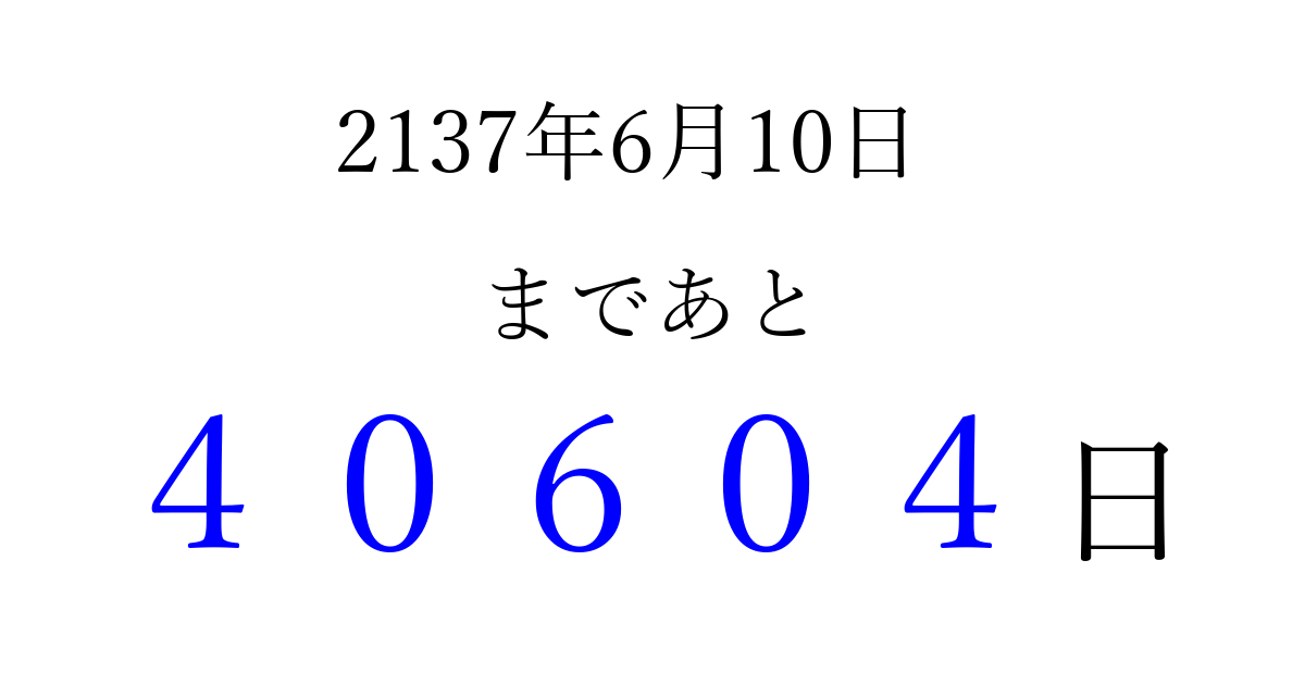 2137年6月10日(月)まで あと 99999 日です 追加すると、トップページからすぐ選べるようになります ※2026/04/09現在の結果です。 最新の状態に更新する ↓シェアして、タイムライン上にカウントダウンを表示しよう!↓ 📤 この結果を共有する Tweet シェア Threads Bluesky 別の日付でカウントダウン 2137年6月のカレンダー このページをブックマークに追加すると、いつでもカウントダウンを確認できます。 (PC: Ctrl+D / Mac: ⌘+D) hitome-notes.comでは以下のページも運営しています。 指定日と期間から日付を計算 | ガチャ確率計算・シミュレーション | プライバシー・ポリシー 運営者:Avocado