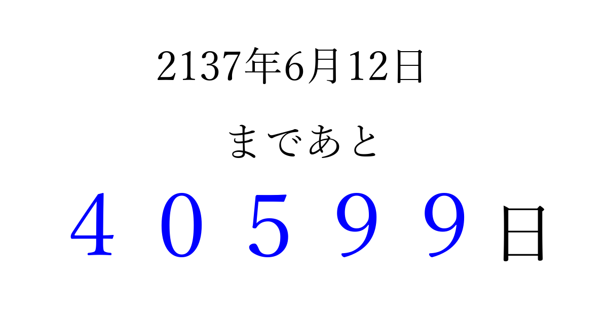 2137年6月12日(水)まで あと 99999 日です 追加すると、トップページからすぐ選べるようになります ※2026/04/16現在の結果です。 最新の状態に更新する ↓シェアして、タイムライン上にカウントダウンを表示しよう!↓ 📤 この結果を共有する Tweet シェア Threads Bluesky 別の日付でカウントダウン 2137年6月のカレンダー このページをブックマークに追加すると、いつでもカウントダウンを確認できます。 (PC: Ctrl+D / Mac: ⌘+D) hitome-notes.comでは以下のページも運営しています。 指定日と期間から日付を計算 | ガチャ確率計算・シミュレーション | プライバシー・ポリシー 運営者:Avocado
