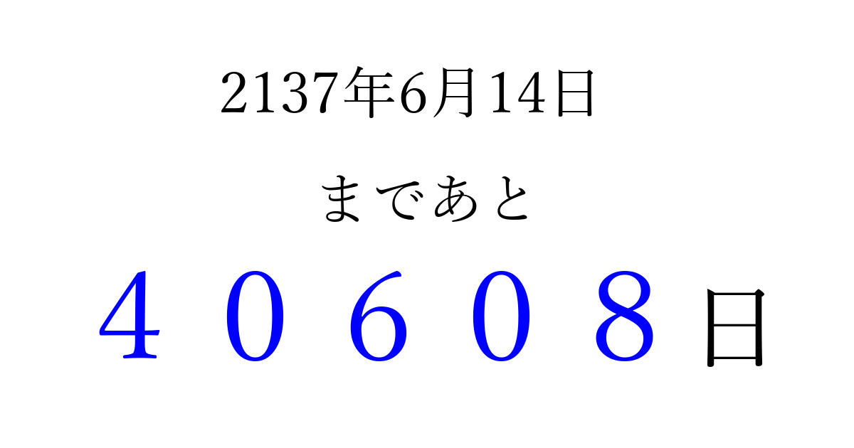 2137年6月14日(金)まで あと 99999 日です 追加すると、トップページからすぐ選べるようになります ※2026/04/09現在の結果です。 最新の状態に更新する ↓シェアして、タイムライン上にカウントダウンを表示しよう!↓ 📤 この結果を共有する Tweet シェア Threads Bluesky 別の日付でカウントダウン 2137年6月のカレンダー このページをブックマークに追加すると、いつでもカウントダウンを確認できます。 (PC: Ctrl+D / Mac: ⌘+D) hitome-notes.comでは以下のページも運営しています。 指定日と期間から日付を計算 | ガチャ確率計算・シミュレーション | プライバシー・ポリシー 運営者:Avocado