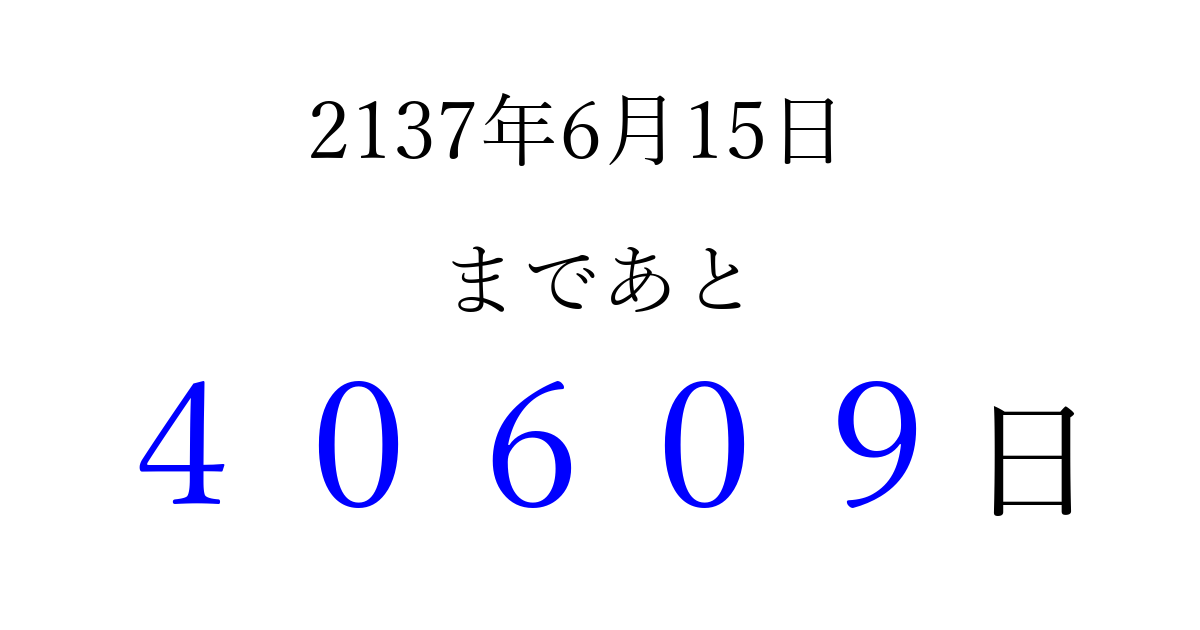 2137年6月15日(土)まで あと 99999 日です 追加すると、トップページからすぐ選べるようになります ※2026/04/09現在の結果です。 最新の状態に更新する ↓シェアして、タイムライン上にカウントダウンを表示しよう!↓ 📤 この結果を共有する Tweet シェア Threads Bluesky 別の日付でカウントダウン 2137年6月のカレンダー このページをブックマークに追加すると、いつでもカウントダウンを確認できます。 (PC: Ctrl+D / Mac: ⌘+D) hitome-notes.comでは以下のページも運営しています。 指定日と期間から日付を計算 | ガチャ確率計算・シミュレーション | プライバシー・ポリシー 運営者:Avocado