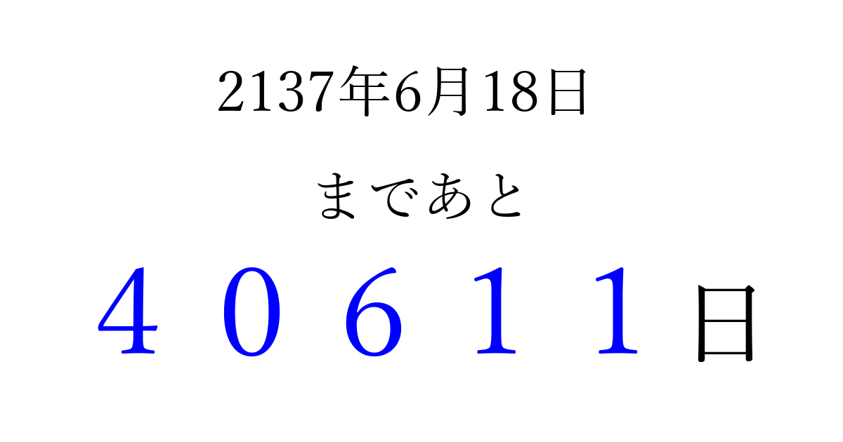 2137年6月18日(火)まで あと 99999 日です 追加すると、トップページからすぐ選べるようになります ※2026/04/10現在の結果です。 最新の状態に更新する ↓シェアして、タイムライン上にカウントダウンを表示しよう!↓ 📤 この結果を共有する Tweet シェア Threads Bluesky 別の日付でカウントダウン 2137年6月のカレンダー このページをブックマークに追加すると、いつでもカウントダウンを確認できます。 (PC: Ctrl+D / Mac: ⌘+D) hitome-notes.comでは以下のページも運営しています。 指定日と期間から日付を計算 | ガチャ確率計算・シミュレーション | プライバシー・ポリシー 運営者:Avocado