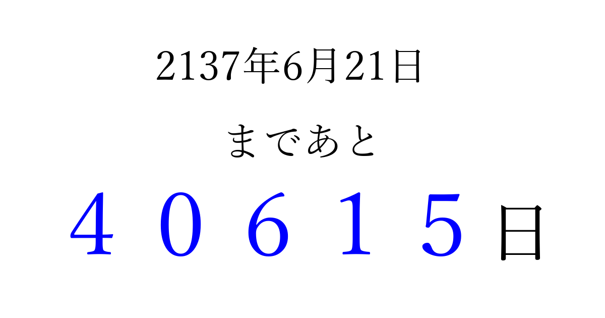 2137年6月21日(金)まで あと 99999 日です 追加すると、トップページからすぐ選べるようになります ※2026/04/09現在の結果です。 最新の状態に更新する ↓シェアして、タイムライン上にカウントダウンを表示しよう!↓ 📤 この結果を共有する Tweet シェア Threads Bluesky 別の日付でカウントダウン 2137年6月のカレンダー このページをブックマークに追加すると、いつでもカウントダウンを確認できます。 (PC: Ctrl+D / Mac: ⌘+D) hitome-notes.comでは以下のページも運営しています。 指定日と期間から日付を計算 | ガチャ確率計算・シミュレーション | プライバシー・ポリシー 運営者:Avocado