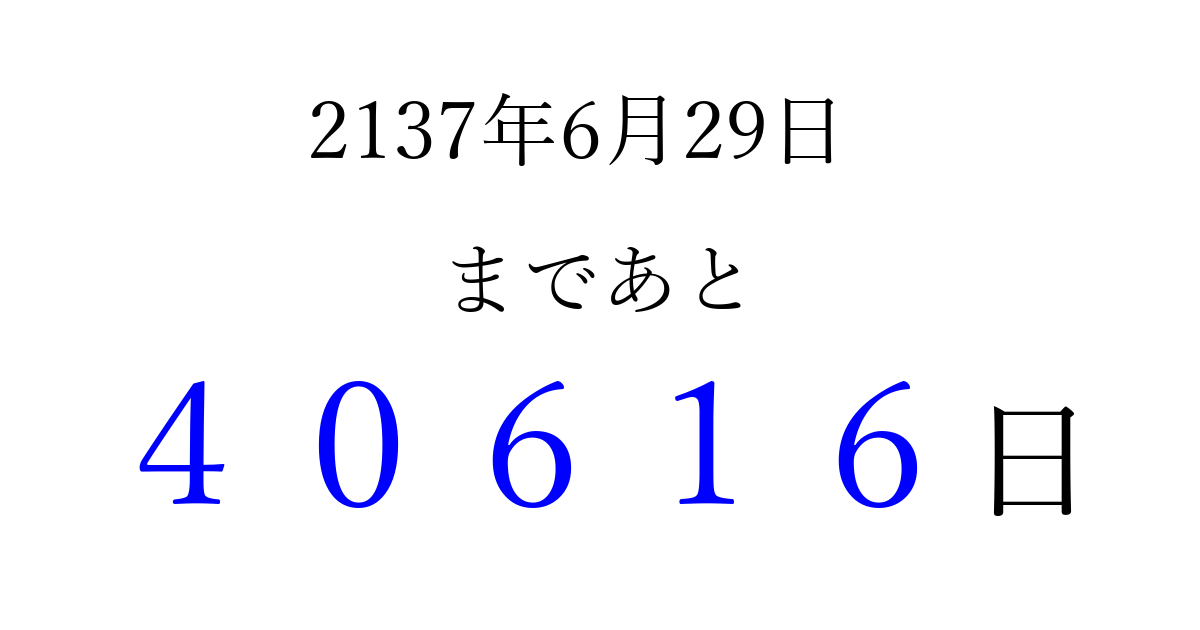 2137年6月29日(土)まで あと 99999 日です 追加すると、トップページからすぐ選べるようになります ※2026/04/16現在の結果です。 最新の状態に更新する ↓シェアして、タイムライン上にカウントダウンを表示しよう!↓ 📤 この結果を共有する Tweet シェア Threads Bluesky 別の日付でカウントダウン 2137年6月のカレンダー このページをブックマークに追加すると、いつでもカウントダウンを確認できます。 (PC: Ctrl+D / Mac: ⌘+D) hitome-notes.comでは以下のページも運営しています。 指定日と期間から日付を計算 | ガチャ確率計算・シミュレーション | プライバシー・ポリシー 運営者:Avocado