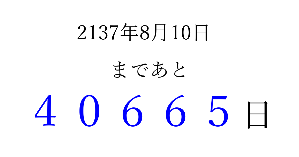 2137年8月10日(土)まで あと 99999 日です 追加すると、トップページからすぐ選べるようになります ※2026/04/09現在の結果です。 最新の状態に更新する ↓シェアして、タイムライン上にカウントダウンを表示しよう!↓ 📤 この結果を共有する Tweet シェア Threads Bluesky 別の日付でカウントダウン 2137年8月のカレンダー このページをブックマークに追加すると、いつでもカウントダウンを確認できます。 (PC: Ctrl+D / Mac: ⌘+D) hitome-notes.comでは以下のページも運営しています。 指定日と期間から日付を計算 | ガチャ確率計算・シミュレーション | プライバシー・ポリシー 運営者:Avocado