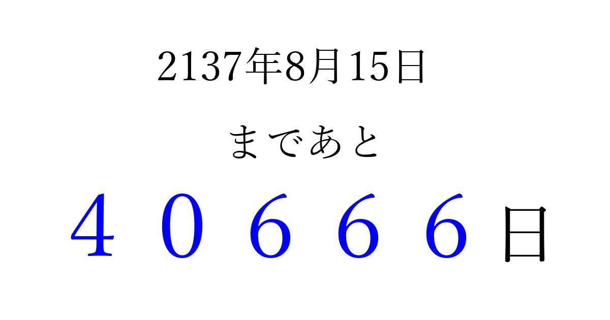 2137年8月15日(木)まで あと 99999 日です 追加すると、トップページからすぐ選べるようになります ※2026/04/13現在の結果です。 最新の状態に更新する ↓シェアして、タイムライン上にカウントダウンを表示しよう!↓ 📤 この結果を共有する Tweet シェア Threads Bluesky 別の日付でカウントダウン 2137年8月のカレンダー このページをブックマークに追加すると、いつでもカウントダウンを確認できます。 (PC: Ctrl+D / Mac: ⌘+D) hitome-notes.comでは以下のページも運営しています。 指定日と期間から日付を計算 | ガチャ確率計算・シミュレーション | プライバシー・ポリシー 運営者:Avocado