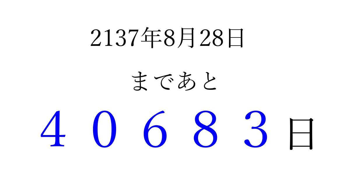 2137年8月28日(水)まで あと 99999 日です 追加すると、トップページからすぐ選べるようになります ※2026/04/09現在の結果です。 最新の状態に更新する ↓シェアして、タイムライン上にカウントダウンを表示しよう!↓ 📤 この結果を共有する Tweet シェア Threads Bluesky 別の日付でカウントダウン 2137年8月のカレンダー このページをブックマークに追加すると、いつでもカウントダウンを確認できます。 (PC: Ctrl+D / Mac: ⌘+D) hitome-notes.comでは以下のページも運営しています。 指定日と期間から日付を計算 | ガチャ確率計算・シミュレーション | プライバシー・ポリシー 運営者:Avocado