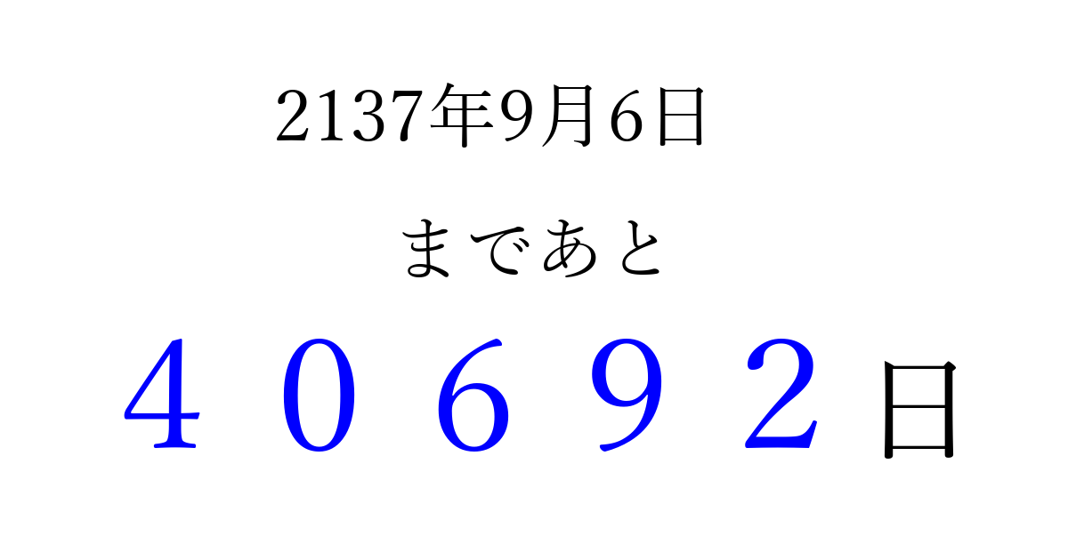 2137年9月6日(金)まで あと 99999 日です 追加すると、トップページからすぐ選べるようになります ※2026/04/09現在の結果です。 最新の状態に更新する ↓シェアして、タイムライン上にカウントダウンを表示しよう!↓ 📤 この結果を共有する Tweet シェア Threads Bluesky 別の日付でカウントダウン 2137年9月のカレンダー このページをブックマークに追加すると、いつでもカウントダウンを確認できます。 (PC: Ctrl+D / Mac: ⌘+D) hitome-notes.comでは以下のページも運営しています。 指定日と期間から日付を計算 | ガチャ確率計算・シミュレーション | プライバシー・ポリシー 運営者:Avocado