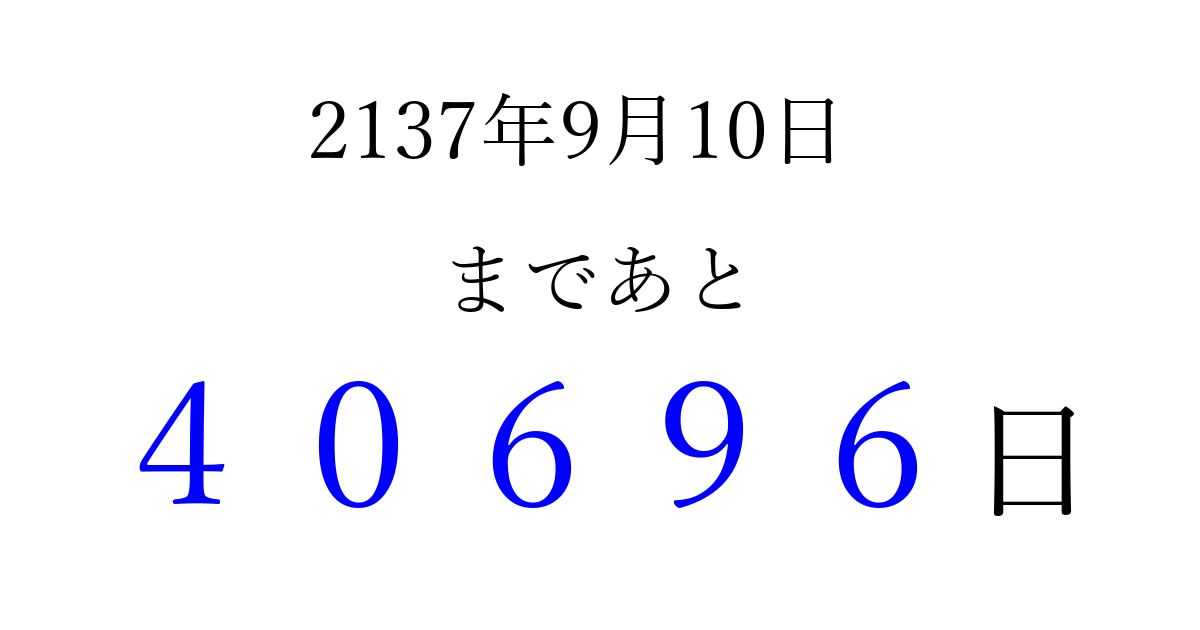 2137年9月10日(火)まで あと 99999 日です 追加すると、トップページからすぐ選べるようになります ※2026/04/09現在の結果です。 最新の状態に更新する ↓シェアして、タイムライン上にカウントダウンを表示しよう!↓ 📤 この結果を共有する Tweet シェア Threads Bluesky 別の日付でカウントダウン 2137年9月のカレンダー このページをブックマークに追加すると、いつでもカウントダウンを確認できます。 (PC: Ctrl+D / Mac: ⌘+D) hitome-notes.comでは以下のページも運営しています。 指定日と期間から日付を計算 | ガチャ確率計算・シミュレーション | プライバシー・ポリシー 運営者:Avocado
