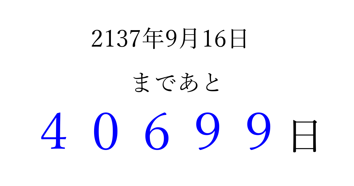 2137年9月16日(月)まで あと 99999 日です 追加すると、トップページからすぐ選べるようになります ※2026/04/12現在の結果です。 最新の状態に更新する ↓シェアして、タイムライン上にカウントダウンを表示しよう!↓ 📤 この結果を共有する Tweet シェア Threads Bluesky 別の日付でカウントダウン 2137年9月のカレンダー このページをブックマークに追加すると、いつでもカウントダウンを確認できます。 (PC: Ctrl+D / Mac: ⌘+D) hitome-notes.comでは以下のページも運営しています。 指定日と期間から日付を計算 | ガチャ確率計算・シミュレーション | プライバシー・ポリシー 運営者:Avocado