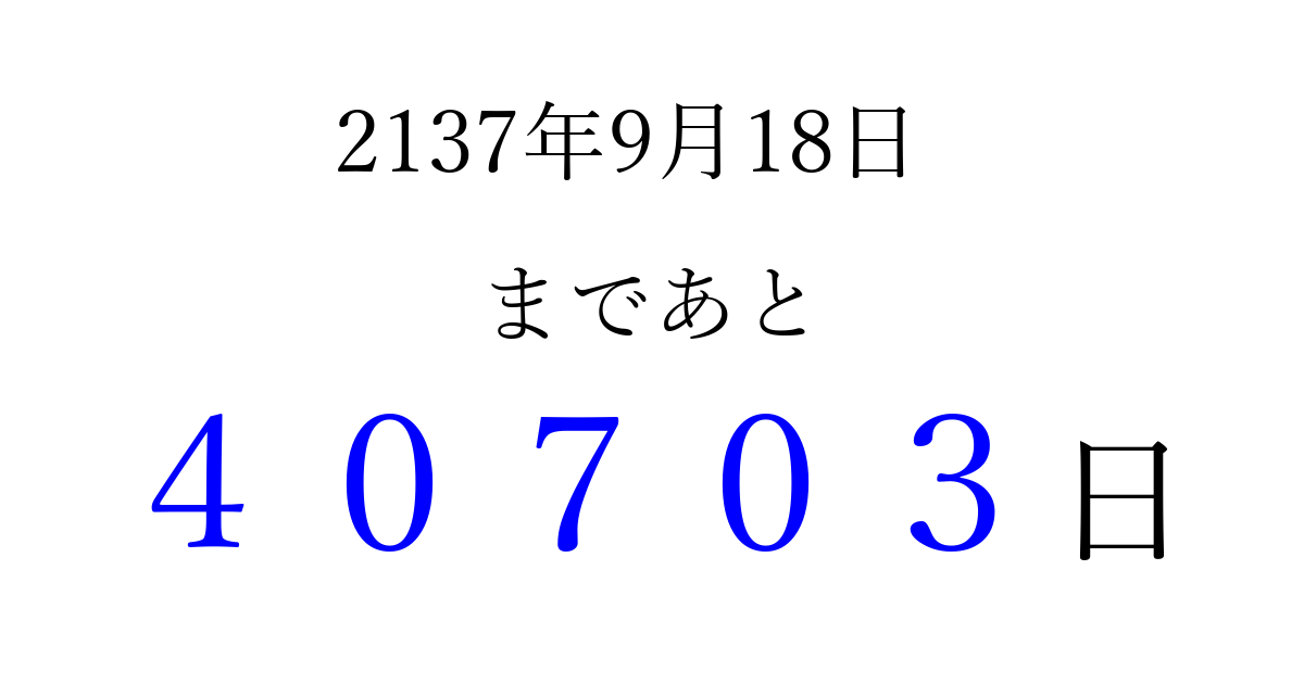 2137年9月18日(水)まで あと 99999 日です 追加すると、トップページからすぐ選べるようになります ※2026/04/10現在の結果です。 最新の状態に更新する ↓シェアして、タイムライン上にカウントダウンを表示しよう!↓ 📤 この結果を共有する Tweet シェア Threads Bluesky 別の日付でカウントダウン 2137年9月のカレンダー このページをブックマークに追加すると、いつでもカウントダウンを確認できます。 (PC: Ctrl+D / Mac: ⌘+D) hitome-notes.comでは以下のページも運営しています。 指定日と期間から日付を計算 | ガチャ確率計算・シミュレーション | プライバシー・ポリシー 運営者:Avocado