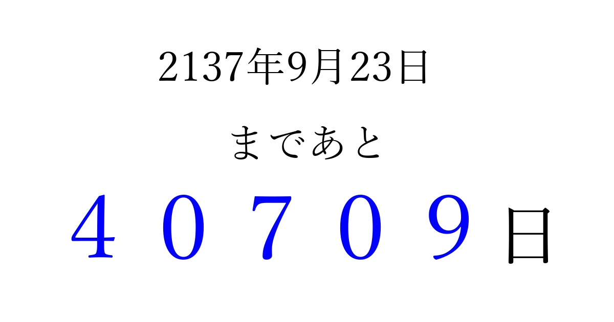 2137年9月23日(月)まで あと 99999 日です 追加すると、トップページからすぐ選べるようになります ※2026/04/09現在の結果です。 最新の状態に更新する ↓シェアして、タイムライン上にカウントダウンを表示しよう!↓ 📤 この結果を共有する Tweet シェア Threads Bluesky 別の日付でカウントダウン 2137年9月のカレンダー このページをブックマークに追加すると、いつでもカウントダウンを確認できます。 (PC: Ctrl+D / Mac: ⌘+D) hitome-notes.comでは以下のページも運営しています。 指定日と期間から日付を計算 | ガチャ確率計算・シミュレーション | プライバシー・ポリシー 運営者:Avocado