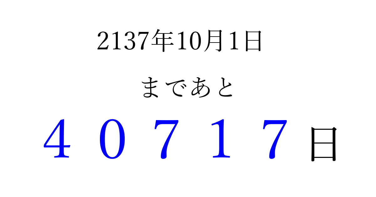 2137年10月1日(火)まで あと 99999 日です 追加すると、トップページからすぐ選べるようになります ※2026/04/09現在の結果です。 最新の状態に更新する ↓シェアして、タイムライン上にカウントダウンを表示しよう!↓ 📤 この結果を共有する Tweet シェア Threads Bluesky 別の日付でカウントダウン 2137年10月のカレンダー このページをブックマークに追加すると、いつでもカウントダウンを確認できます。 (PC: Ctrl+D / Mac: ⌘+D) hitome-notes.comでは以下のページも運営しています。 指定日と期間から日付を計算 | ガチャ確率計算・シミュレーション | プライバシー・ポリシー 運営者:Avocado
