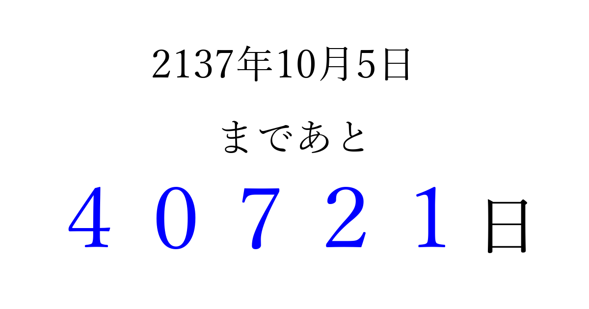 2137年10月5日(土)まで あと 99999 日です 追加すると、トップページからすぐ選べるようになります ※2026/04/09現在の結果です。 最新の状態に更新する ↓シェアして、タイムライン上にカウントダウンを表示しよう!↓ 📤 この結果を共有する Tweet シェア Threads Bluesky 別の日付でカウントダウン 2137年10月のカレンダー このページをブックマークに追加すると、いつでもカウントダウンを確認できます。 (PC: Ctrl+D / Mac: ⌘+D) hitome-notes.comでは以下のページも運営しています。 指定日と期間から日付を計算 | ガチャ確率計算・シミュレーション | プライバシー・ポリシー 運営者:Avocado