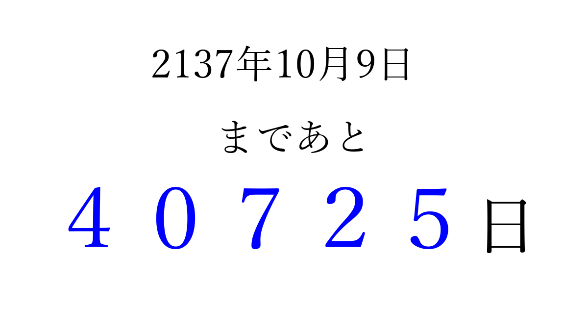 2137年10月9日(水)まで あと 99999 日です 追加すると、トップページからすぐ選べるようになります ※2026/04/09現在の結果です。 最新の状態に更新する ↓シェアして、タイムライン上にカウントダウンを表示しよう!↓ 📤 この結果を共有する Tweet シェア Threads Bluesky 別の日付でカウントダウン 2137年10月のカレンダー このページをブックマークに追加すると、いつでもカウントダウンを確認できます。 (PC: Ctrl+D / Mac: ⌘+D) hitome-notes.comでは以下のページも運営しています。 指定日と期間から日付を計算 | ガチャ確率計算・シミュレーション | プライバシー・ポリシー 運営者:Avocado