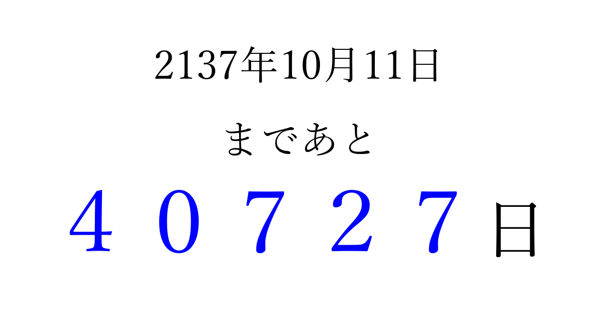 2137年10月11日(金)まで あと 99999 日です 追加すると、トップページからすぐ選べるようになります ※2026/04/09現在の結果です。 最新の状態に更新する ↓シェアして、タイムライン上にカウントダウンを表示しよう!↓ 📤 この結果を共有する Tweet シェア Threads Bluesky 別の日付でカウントダウン 2137年10月のカレンダー このページをブックマークに追加すると、いつでもカウントダウンを確認できます。 (PC: Ctrl+D / Mac: ⌘+D) hitome-notes.comでは以下のページも運営しています。 指定日と期間から日付を計算 | ガチャ確率計算・シミュレーション | プライバシー・ポリシー 運営者:Avocado