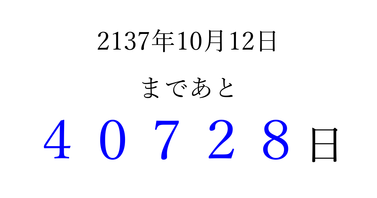 2137年10月12日(土)まで あと 99999 日です 追加すると、トップページからすぐ選べるようになります ※2026/04/09現在の結果です。 最新の状態に更新する ↓シェアして、タイムライン上にカウントダウンを表示しよう!↓ 📤 この結果を共有する Tweet シェア Threads Bluesky 別の日付でカウントダウン 2137年10月のカレンダー このページをブックマークに追加すると、いつでもカウントダウンを確認できます。 (PC: Ctrl+D / Mac: ⌘+D) hitome-notes.comでは以下のページも運営しています。 指定日と期間から日付を計算 | ガチャ確率計算・シミュレーション | プライバシー・ポリシー 運営者:Avocado