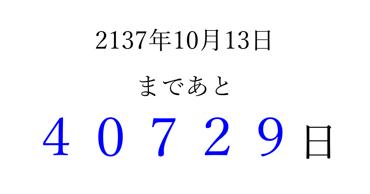 2137年10月13日(日)まで あと 99999 日です 追加すると、トップページからすぐ選べるようになります ※2026/04/09現在の結果です。 最新の状態に更新する ↓シェアして、タイムライン上にカウントダウンを表示しよう!↓ 📤 この結果を共有する Tweet シェア Threads Bluesky 別の日付でカウントダウン 2137年10月のカレンダー このページをブックマークに追加すると、いつでもカウントダウンを確認できます。 (PC: Ctrl+D / Mac: ⌘+D) hitome-notes.comでは以下のページも運営しています。 指定日と期間から日付を計算 | ガチャ確率計算・シミュレーション | プライバシー・ポリシー 運営者:Avocado