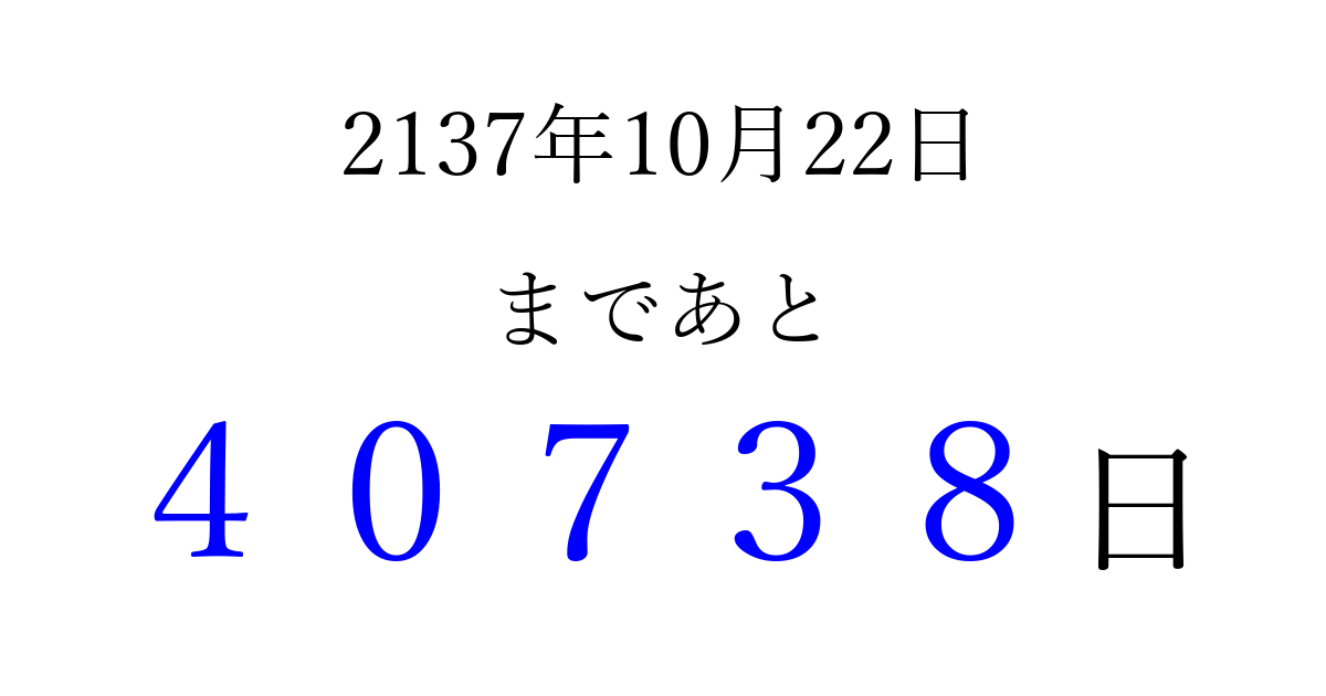2137年10月22日(火)まで あと 99999 日です 追加すると、トップページからすぐ選べるようになります ※2026/04/09現在の結果です。 最新の状態に更新する ↓シェアして、タイムライン上にカウントダウンを表示しよう!↓ 📤 この結果を共有する Tweet シェア Threads Bluesky 別の日付でカウントダウン 2137年10月のカレンダー このページをブックマークに追加すると、いつでもカウントダウンを確認できます。 (PC: Ctrl+D / Mac: ⌘+D) hitome-notes.comでは以下のページも運営しています。 指定日と期間から日付を計算 | ガチャ確率計算・シミュレーション | プライバシー・ポリシー 運営者:Avocado