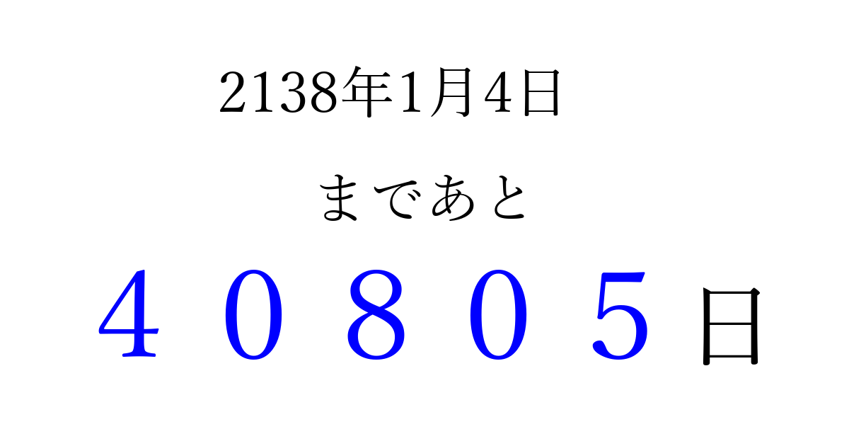 2138年1月4日(土)まで あと 99999 日です 追加すると、トップページからすぐ選べるようになります ※2026/04/16現在の結果です。 最新の状態に更新する ↓シェアして、タイムライン上にカウントダウンを表示しよう!↓ 📤 この結果を共有する Tweet シェア Threads Bluesky 別の日付でカウントダウン 2138年1月のカレンダー このページをブックマークに追加すると、いつでもカウントダウンを確認できます。 (PC: Ctrl+D / Mac: ⌘+D) hitome-notes.comでは以下のページも運営しています。 指定日と期間から日付を計算 | ガチャ確率計算・シミュレーション | プライバシー・ポリシー 運営者:Avocado
