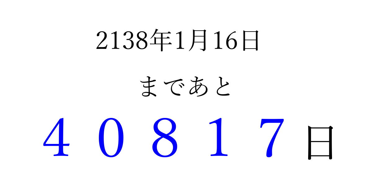 2138年1月16日(木)まで あと 99999 日です 追加すると、トップページからすぐ選べるようになります ※2026/04/16現在の結果です。 最新の状態に更新する ↓シェアして、タイムライン上にカウントダウンを表示しよう!↓ 📤 この結果を共有する Tweet シェア Threads Bluesky 別の日付でカウントダウン 2138年1月のカレンダー このページをブックマークに追加すると、いつでもカウントダウンを確認できます。 (PC: Ctrl+D / Mac: ⌘+D) hitome-notes.comでは以下のページも運営しています。 指定日と期間から日付を計算 | ガチャ確率計算・シミュレーション | プライバシー・ポリシー 運営者:Avocado
