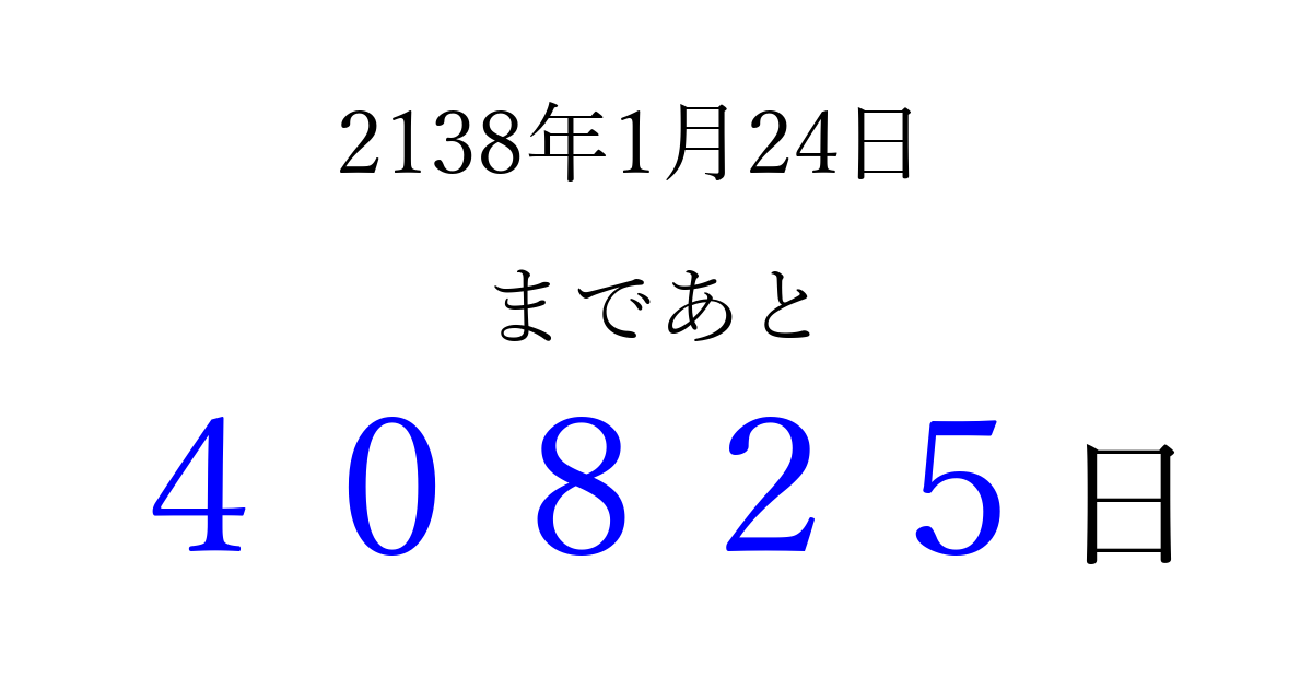 2138年1月24日(金)まで あと 99999 日です 追加すると、トップページからすぐ選べるようになります ※2026/04/16現在の結果です。 最新の状態に更新する ↓シェアして、タイムライン上にカウントダウンを表示しよう!↓ 📤 この結果を共有する Tweet シェア Threads Bluesky 別の日付でカウントダウン 2138年1月のカレンダー このページをブックマークに追加すると、いつでもカウントダウンを確認できます。 (PC: Ctrl+D / Mac: ⌘+D) hitome-notes.comでは以下のページも運営しています。 指定日と期間から日付を計算 | ガチャ確率計算・シミュレーション | プライバシー・ポリシー 運営者:Avocado