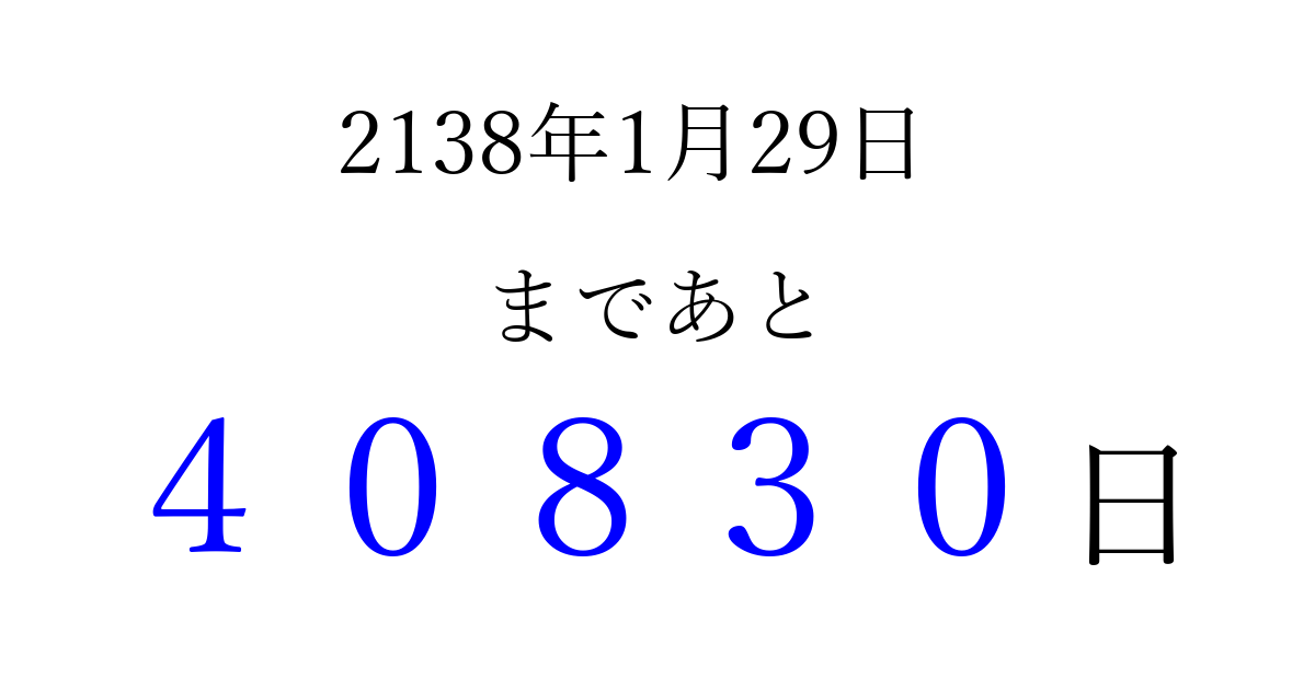 2138年1月29日(水)まで あと 99999 日です 追加すると、トップページからすぐ選べるようになります ※2026/04/16現在の結果です。 最新の状態に更新する ↓シェアして、タイムライン上にカウントダウンを表示しよう!↓ 📤 この結果を共有する Tweet シェア Threads Bluesky 別の日付でカウントダウン 2138年1月のカレンダー このページをブックマークに追加すると、いつでもカウントダウンを確認できます。 (PC: Ctrl+D / Mac: ⌘+D) hitome-notes.comでは以下のページも運営しています。 指定日と期間から日付を計算 | ガチャ確率計算・シミュレーション | プライバシー・ポリシー 運営者:Avocado