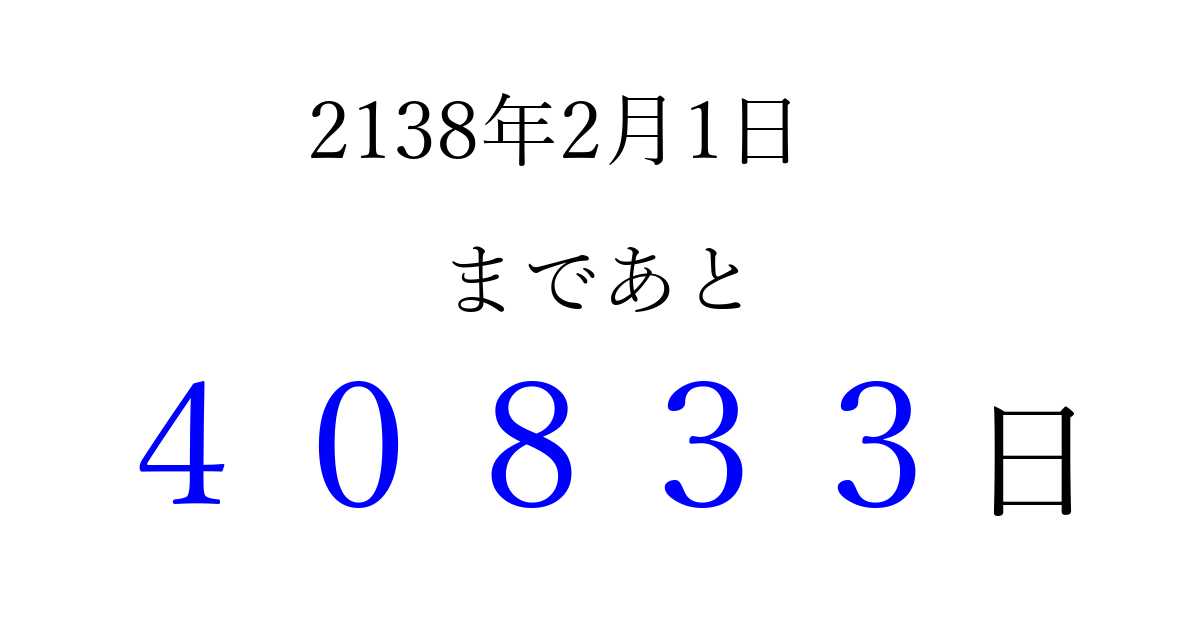 2138年2月1日(土)まで あと 99999 日です 追加すると、トップページからすぐ選べるようになります ※2026/04/16現在の結果です。 最新の状態に更新する ↓シェアして、タイムライン上にカウントダウンを表示しよう!↓ 📤 この結果を共有する Tweet シェア Threads Bluesky 別の日付でカウントダウン 2138年2月のカレンダー このページをブックマークに追加すると、いつでもカウントダウンを確認できます。 (PC: Ctrl+D / Mac: ⌘+D) hitome-notes.comでは以下のページも運営しています。 指定日と期間から日付を計算 | ガチャ確率計算・シミュレーション | プライバシー・ポリシー 運営者:Avocado