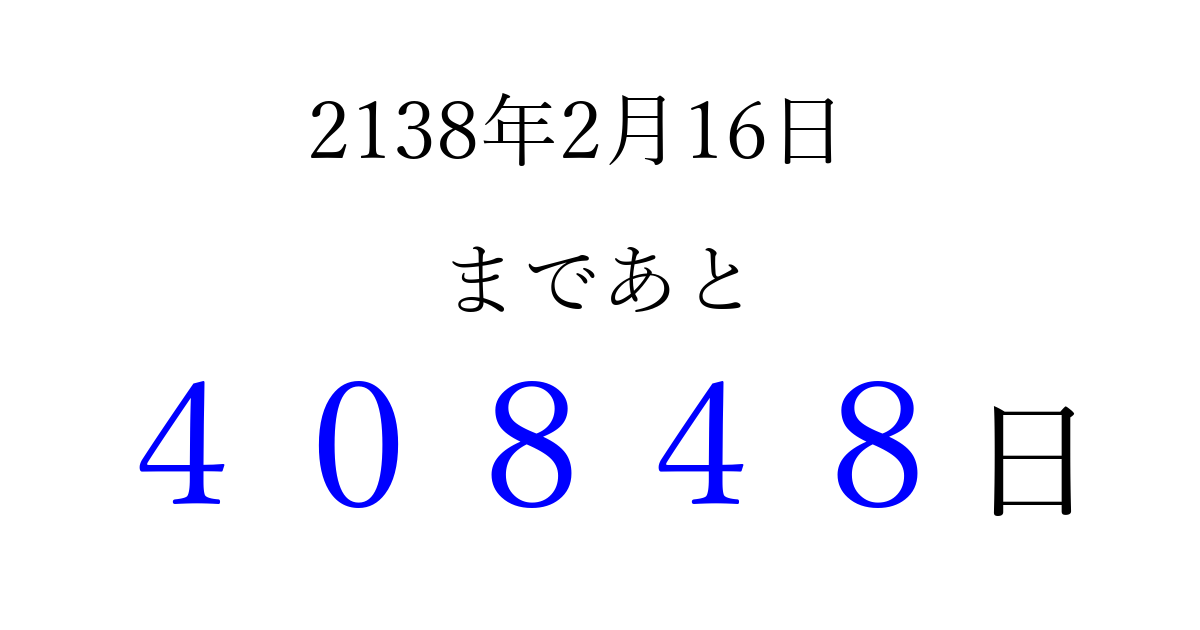 2138年2月16日(日)まで あと 99999 日です 追加すると、トップページからすぐ選べるようになります ※2026/04/16現在の結果です。 最新の状態に更新する ↓シェアして、タイムライン上にカウントダウンを表示しよう!↓ 📤 この結果を共有する Tweet シェア Threads Bluesky 別の日付でカウントダウン 2138年2月のカレンダー このページをブックマークに追加すると、いつでもカウントダウンを確認できます。 (PC: Ctrl+D / Mac: ⌘+D) hitome-notes.comでは以下のページも運営しています。 指定日と期間から日付を計算 | ガチャ確率計算・シミュレーション | プライバシー・ポリシー 運営者:Avocado
