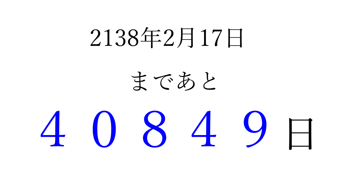 2138年2月17日(月)まで あと 99999 日です 追加すると、トップページからすぐ選べるようになります ※2026/04/16現在の結果です。 最新の状態に更新する ↓シェアして、タイムライン上にカウントダウンを表示しよう!↓ 📤 この結果を共有する Tweet シェア Threads Bluesky 別の日付でカウントダウン 2138年2月のカレンダー このページをブックマークに追加すると、いつでもカウントダウンを確認できます。 (PC: Ctrl+D / Mac: ⌘+D) hitome-notes.comでは以下のページも運営しています。 指定日と期間から日付を計算 | ガチャ確率計算・シミュレーション | プライバシー・ポリシー 運営者:Avocado
