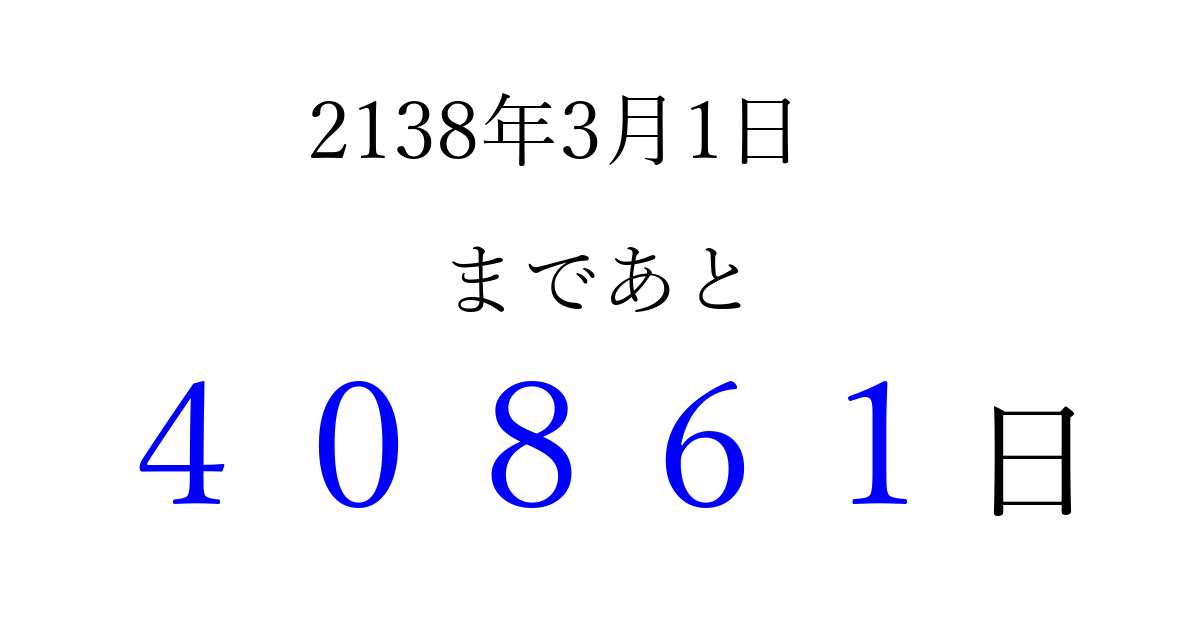 2138年3月1日(土)まで あと 99999 日です 追加すると、トップページからすぐ選べるようになります ※2026/04/16現在の結果です。 最新の状態に更新する ↓シェアして、タイムライン上にカウントダウンを表示しよう!↓ 📤 この結果を共有する Tweet シェア Threads Bluesky 別の日付でカウントダウン 2138年3月のカレンダー このページをブックマークに追加すると、いつでもカウントダウンを確認できます。 (PC: Ctrl+D / Mac: ⌘+D) hitome-notes.comでは以下のページも運営しています。 指定日と期間から日付を計算 | ガチャ確率計算・シミュレーション | プライバシー・ポリシー 運営者:Avocado