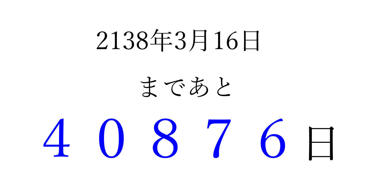 2138年3月16日(日)まで あと 99999 日です 追加すると、トップページからすぐ選べるようになります ※2026/04/16現在の結果です。 最新の状態に更新する ↓シェアして、タイムライン上にカウントダウンを表示しよう!↓ 📤 この結果を共有する Tweet シェア Threads Bluesky 別の日付でカウントダウン 2138年3月のカレンダー このページをブックマークに追加すると、いつでもカウントダウンを確認できます。 (PC: Ctrl+D / Mac: ⌘+D) hitome-notes.comでは以下のページも運営しています。 指定日と期間から日付を計算 | ガチャ確率計算・シミュレーション | プライバシー・ポリシー 運営者:Avocado