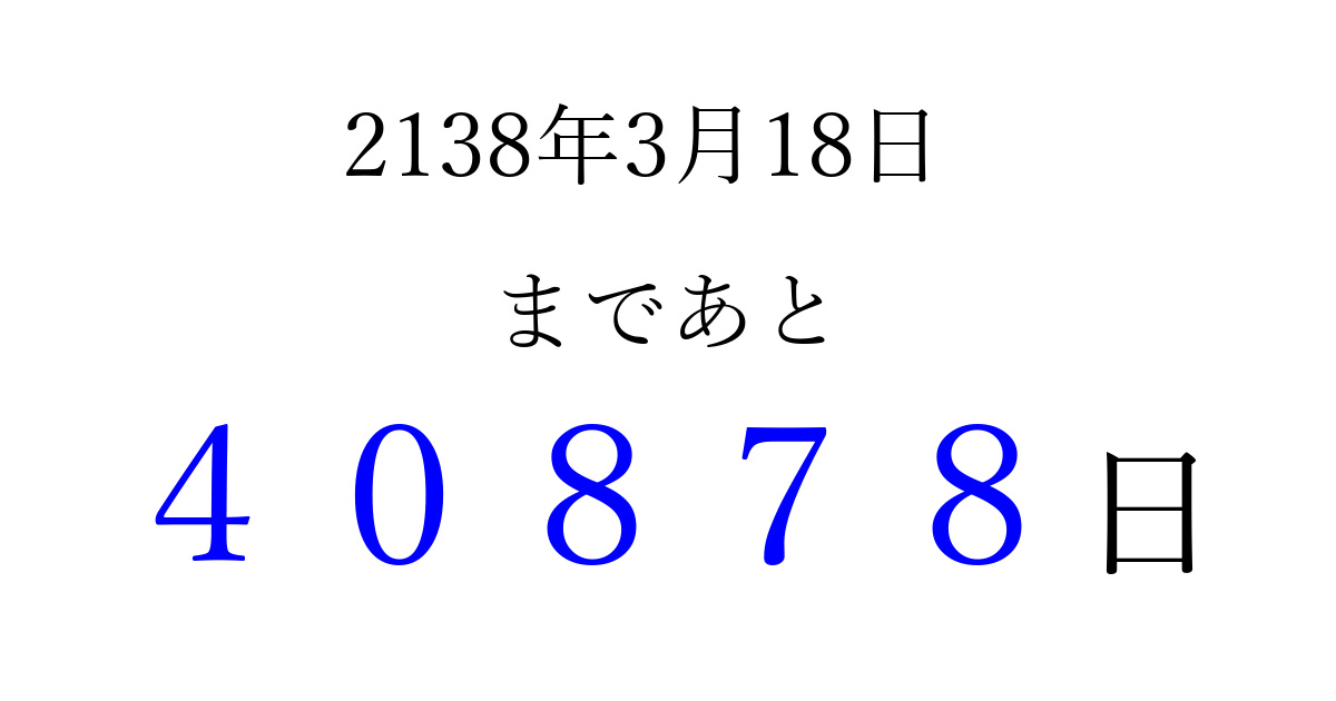 2138年3月18日(火)まで あと 99999 日です 追加すると、トップページからすぐ選べるようになります ※2026/04/16現在の結果です。 最新の状態に更新する ↓シェアして、タイムライン上にカウントダウンを表示しよう!↓ 📤 この結果を共有する Tweet シェア Threads Bluesky 別の日付でカウントダウン 2138年3月のカレンダー このページをブックマークに追加すると、いつでもカウントダウンを確認できます。 (PC: Ctrl+D / Mac: ⌘+D) hitome-notes.comでは以下のページも運営しています。 指定日と期間から日付を計算 | ガチャ確率計算・シミュレーション | プライバシー・ポリシー 運営者:Avocado