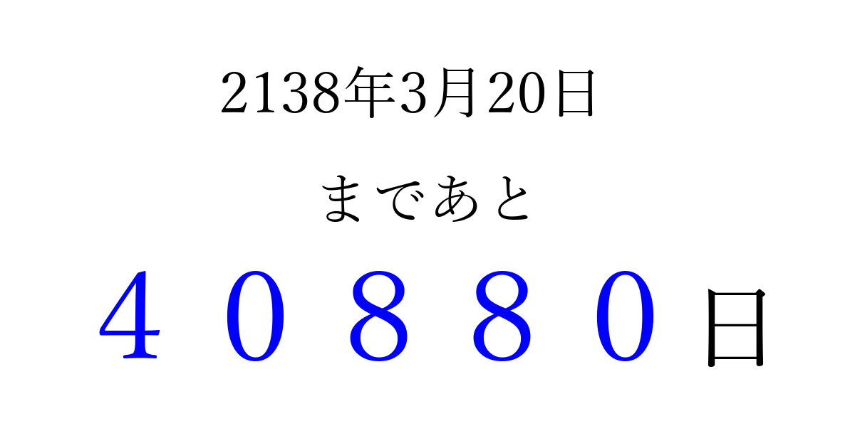 2138年3月20日(木)まで あと 99999 日です 追加すると、トップページからすぐ選べるようになります ※2026/04/16現在の結果です。 最新の状態に更新する ↓シェアして、タイムライン上にカウントダウンを表示しよう!↓ 📤 この結果を共有する Tweet シェア Threads Bluesky 別の日付でカウントダウン 2138年3月のカレンダー このページをブックマークに追加すると、いつでもカウントダウンを確認できます。 (PC: Ctrl+D / Mac: ⌘+D) hitome-notes.comでは以下のページも運営しています。 指定日と期間から日付を計算 | ガチャ確率計算・シミュレーション | プライバシー・ポリシー 運営者:Avocado