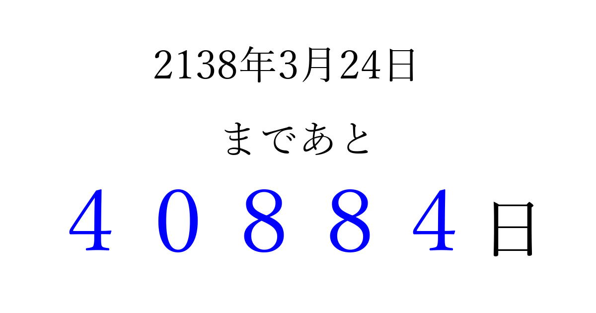2138年3月24日(月)まで あと 99999 日です 追加すると、トップページからすぐ選べるようになります ※2026/04/16現在の結果です。 最新の状態に更新する ↓シェアして、タイムライン上にカウントダウンを表示しよう!↓ 📤 この結果を共有する Tweet シェア Threads Bluesky 別の日付でカウントダウン 2138年3月のカレンダー このページをブックマークに追加すると、いつでもカウントダウンを確認できます。 (PC: Ctrl+D / Mac: ⌘+D) hitome-notes.comでは以下のページも運営しています。 指定日と期間から日付を計算 | ガチャ確率計算・シミュレーション | プライバシー・ポリシー 運営者:Avocado