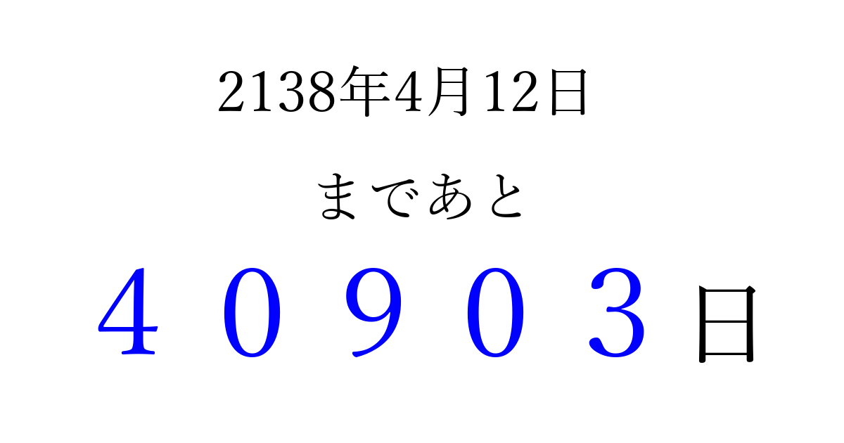 2138年4月12日(土)まで あと 99999 日です 追加すると、トップページからすぐ選べるようになります ※2026/04/16現在の結果です。 最新の状態に更新する ↓シェアして、タイムライン上にカウントダウンを表示しよう!↓ 📤 この結果を共有する Tweet シェア Threads Bluesky 別の日付でカウントダウン 2138年4月のカレンダー このページをブックマークに追加すると、いつでもカウントダウンを確認できます。 (PC: Ctrl+D / Mac: ⌘+D) hitome-notes.comでは以下のページも運営しています。 指定日と期間から日付を計算 | ガチャ確率計算・シミュレーション | プライバシー・ポリシー 運営者:Avocado