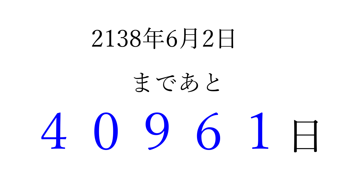 2138年6月2日(月)まで あと 99999 日です 追加すると、トップページからすぐ選べるようになります ※2026/04/09現在の結果です。 最新の状態に更新する ↓シェアして、タイムライン上にカウントダウンを表示しよう!↓ 📤 この結果を共有する Tweet シェア Threads Bluesky 別の日付でカウントダウン 2138年6月のカレンダー このページをブックマークに追加すると、いつでもカウントダウンを確認できます。 (PC: Ctrl+D / Mac: ⌘+D) hitome-notes.comでは以下のページも運営しています。 指定日と期間から日付を計算 | ガチャ確率計算・シミュレーション | プライバシー・ポリシー 運営者:Avocado