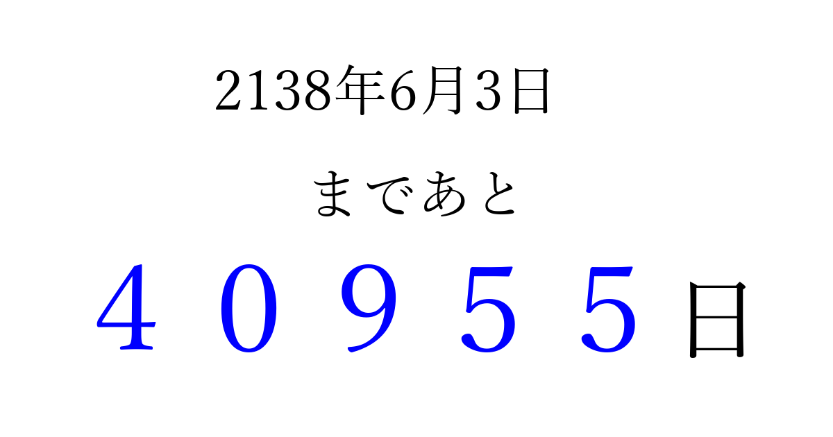 2138年6月3日(火)まで あと 99999 日です 追加すると、トップページからすぐ選べるようになります ※2026/04/16現在の結果です。 最新の状態に更新する ↓シェアして、タイムライン上にカウントダウンを表示しよう!↓ 📤 この結果を共有する Tweet シェア Threads Bluesky 別の日付でカウントダウン 2138年6月のカレンダー このページをブックマークに追加すると、いつでもカウントダウンを確認できます。 (PC: Ctrl+D / Mac: ⌘+D) hitome-notes.comでは以下のページも運営しています。 指定日と期間から日付を計算 | ガチャ確率計算・シミュレーション | プライバシー・ポリシー 運営者:Avocado