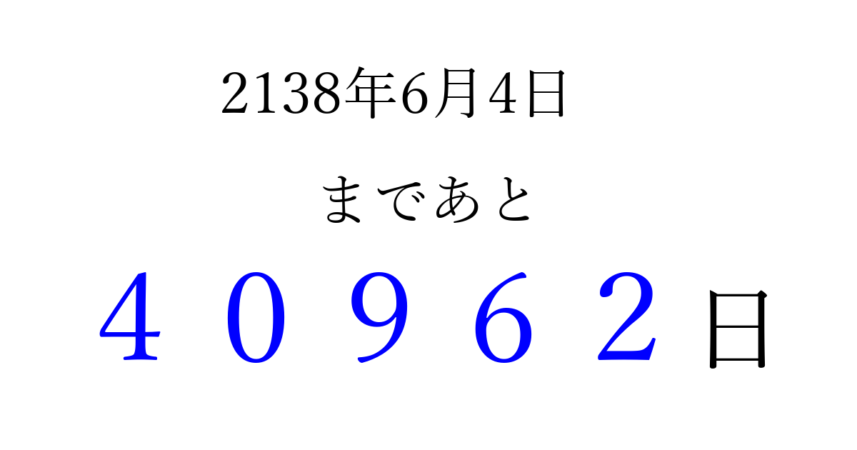 2138年6月4日(水)まで あと 99999 日です 追加すると、トップページからすぐ選べるようになります ※2026/04/10現在の結果です。 最新の状態に更新する ↓シェアして、タイムライン上にカウントダウンを表示しよう!↓ 📤 この結果を共有する Tweet シェア Threads Bluesky 別の日付でカウントダウン 2138年6月のカレンダー このページをブックマークに追加すると、いつでもカウントダウンを確認できます。 (PC: Ctrl+D / Mac: ⌘+D) hitome-notes.comでは以下のページも運営しています。 指定日と期間から日付を計算 | ガチャ確率計算・シミュレーション | プライバシー・ポリシー 運営者:Avocado