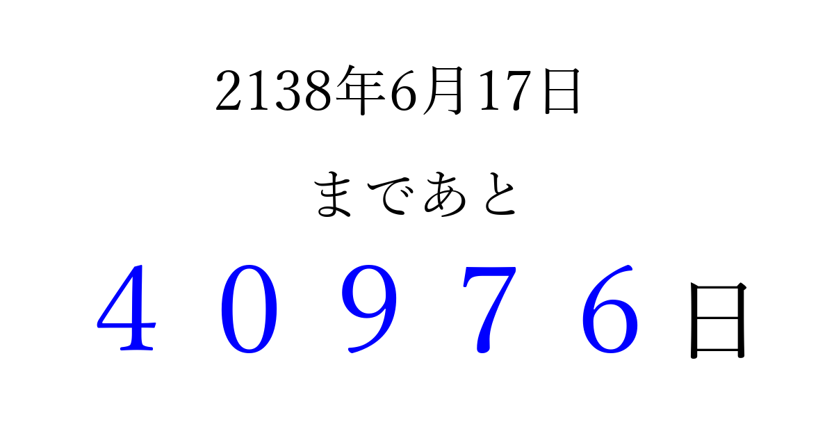 2138年6月17日(火)まで あと 99999 日です 追加すると、トップページからすぐ選べるようになります ※2026/04/09現在の結果です。 最新の状態に更新する ↓シェアして、タイムライン上にカウントダウンを表示しよう!↓ 📤 この結果を共有する Tweet シェア Threads Bluesky 別の日付でカウントダウン 2138年6月のカレンダー このページをブックマークに追加すると、いつでもカウントダウンを確認できます。 (PC: Ctrl+D / Mac: ⌘+D) hitome-notes.comでは以下のページも運営しています。 指定日と期間から日付を計算 | ガチャ確率計算・シミュレーション | プライバシー・ポリシー 運営者:Avocado
