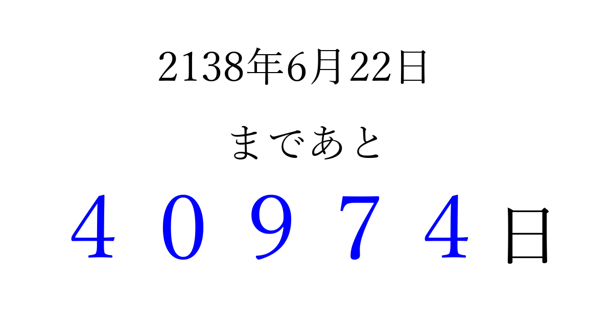 2138年6月22日(日)まで あと 99999 日です 追加すると、トップページからすぐ選べるようになります ※2026/04/16現在の結果です。 最新の状態に更新する ↓シェアして、タイムライン上にカウントダウンを表示しよう!↓ 📤 この結果を共有する Tweet シェア Threads Bluesky 別の日付でカウントダウン 2138年6月のカレンダー このページをブックマークに追加すると、いつでもカウントダウンを確認できます。 (PC: Ctrl+D / Mac: ⌘+D) hitome-notes.comでは以下のページも運営しています。 指定日と期間から日付を計算 | ガチャ確率計算・シミュレーション | プライバシー・ポリシー 運営者:Avocado