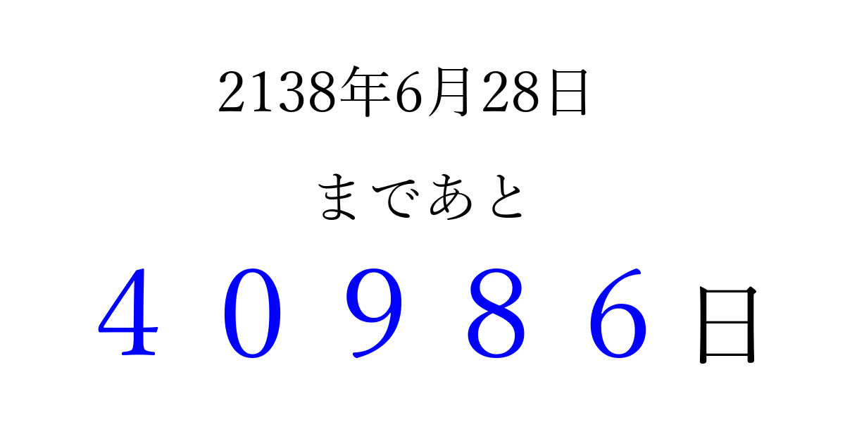 2138年6月28日(土)まで あと 99999 日です 追加すると、トップページからすぐ選べるようになります ※2026/04/10現在の結果です。 最新の状態に更新する ↓シェアして、タイムライン上にカウントダウンを表示しよう!↓ 📤 この結果を共有する Tweet シェア Threads Bluesky 別の日付でカウントダウン 2138年6月のカレンダー このページをブックマークに追加すると、いつでもカウントダウンを確認できます。 (PC: Ctrl+D / Mac: ⌘+D) hitome-notes.comでは以下のページも運営しています。 指定日と期間から日付を計算 | ガチャ確率計算・シミュレーション | プライバシー・ポリシー 運営者:Avocado