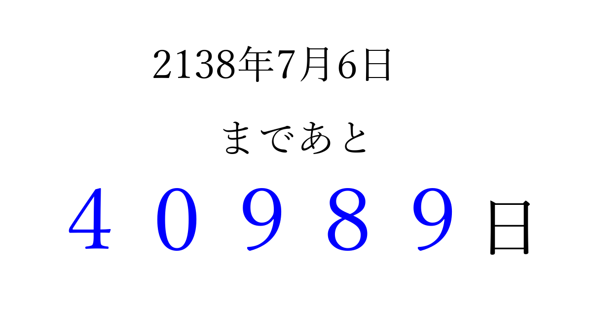 2138年7月6日(日)まで あと 99999 日です 追加すると、トップページからすぐ選べるようになります ※2026/04/15現在の結果です。 最新の状態に更新する ↓シェアして、タイムライン上にカウントダウンを表示しよう!↓ 📤 この結果を共有する Tweet シェア Threads Bluesky 別の日付でカウントダウン 2138年7月のカレンダー このページをブックマークに追加すると、いつでもカウントダウンを確認できます。 (PC: Ctrl+D / Mac: ⌘+D) hitome-notes.comでは以下のページも運営しています。 指定日と期間から日付を計算 | ガチャ確率計算・シミュレーション | プライバシー・ポリシー 運営者:Avocado