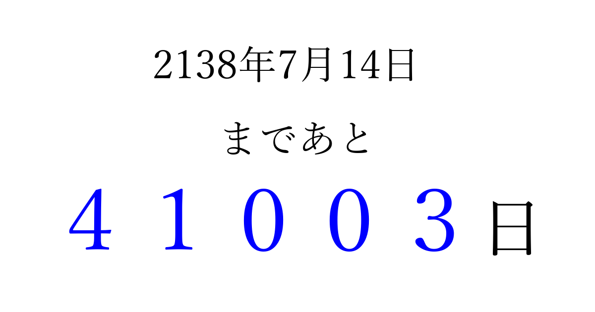 2138年7月14日(月)まで あと 99999 日です 追加すると、トップページからすぐ選べるようになります ※2026/04/09現在の結果です。 最新の状態に更新する ↓シェアして、タイムライン上にカウントダウンを表示しよう!↓ 📤 この結果を共有する Tweet シェア Threads Bluesky 別の日付でカウントダウン 2138年7月のカレンダー このページをブックマークに追加すると、いつでもカウントダウンを確認できます。 (PC: Ctrl+D / Mac: ⌘+D) hitome-notes.comでは以下のページも運営しています。 指定日と期間から日付を計算 | ガチャ確率計算・シミュレーション | プライバシー・ポリシー 運営者:Avocado