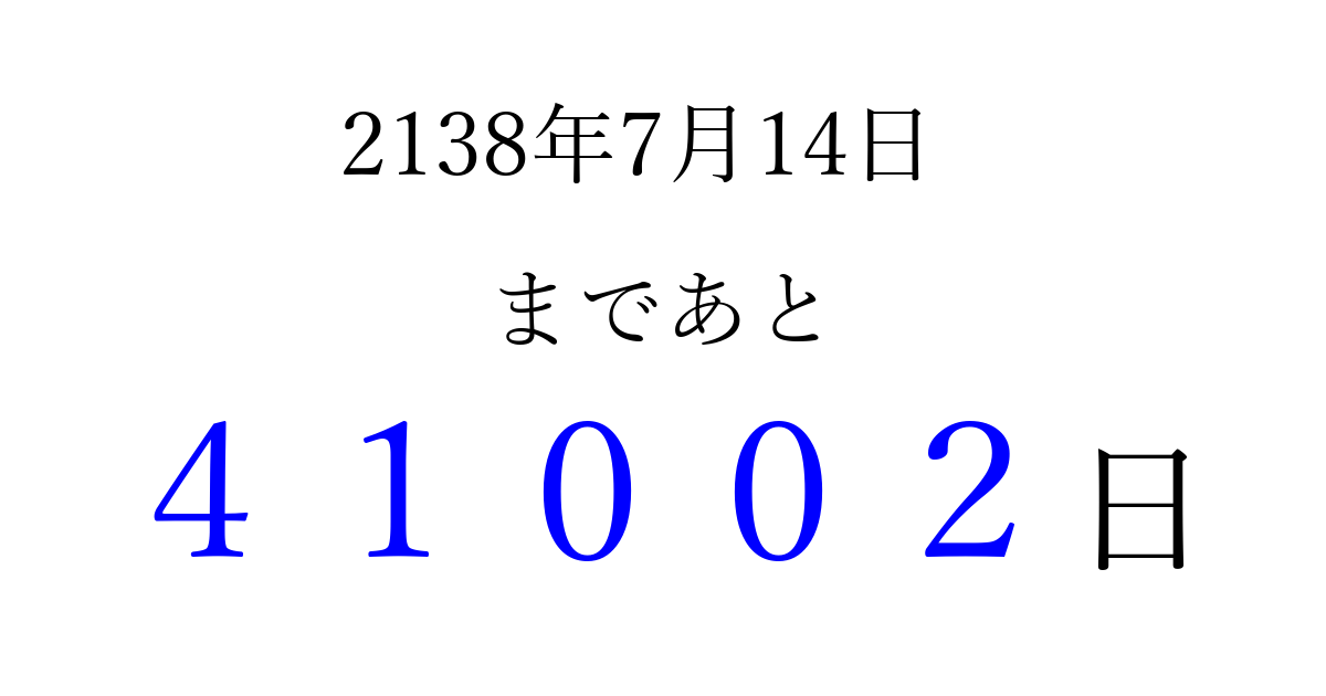 2138年7月14日(月)まで あと 99999 日です 追加すると、トップページからすぐ選べるようになります ※2026/04/10現在の結果です。 最新の状態に更新する ↓シェアして、タイムライン上にカウントダウンを表示しよう!↓ 📤 この結果を共有する Tweet シェア Threads Bluesky 別の日付でカウントダウン 2138年7月のカレンダー このページをブックマークに追加すると、いつでもカウントダウンを確認できます。 (PC: Ctrl+D / Mac: ⌘+D) hitome-notes.comでは以下のページも運営しています。 指定日と期間から日付を計算 | ガチャ確率計算・シミュレーション | プライバシー・ポリシー 運営者:Avocado